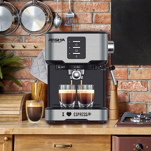 اسپرسو ساز عرشیا مدل EM145 2697 یک ماشین نوشیدنی ساز هوشمند با توان 850 وات برای شروع یک روز خوب خواهد بود. این محصول با بدنه فلزی و طراحی مدرن و زیبایی که دارد برای آشپزخانه و یا محل کاری مناسب است. اسپرسوساز ARSHIA با فشار پمپ 15 بار و سیستم گرمایش ترمو بلوک، تهیه یک قهوه دلچسب و عالی را تضمین می کند. مخزن آب این دستگاه با گنجایش 1.5 لیتر، قابلیت جداسازی را دارد و به راحتی پر می شود.
