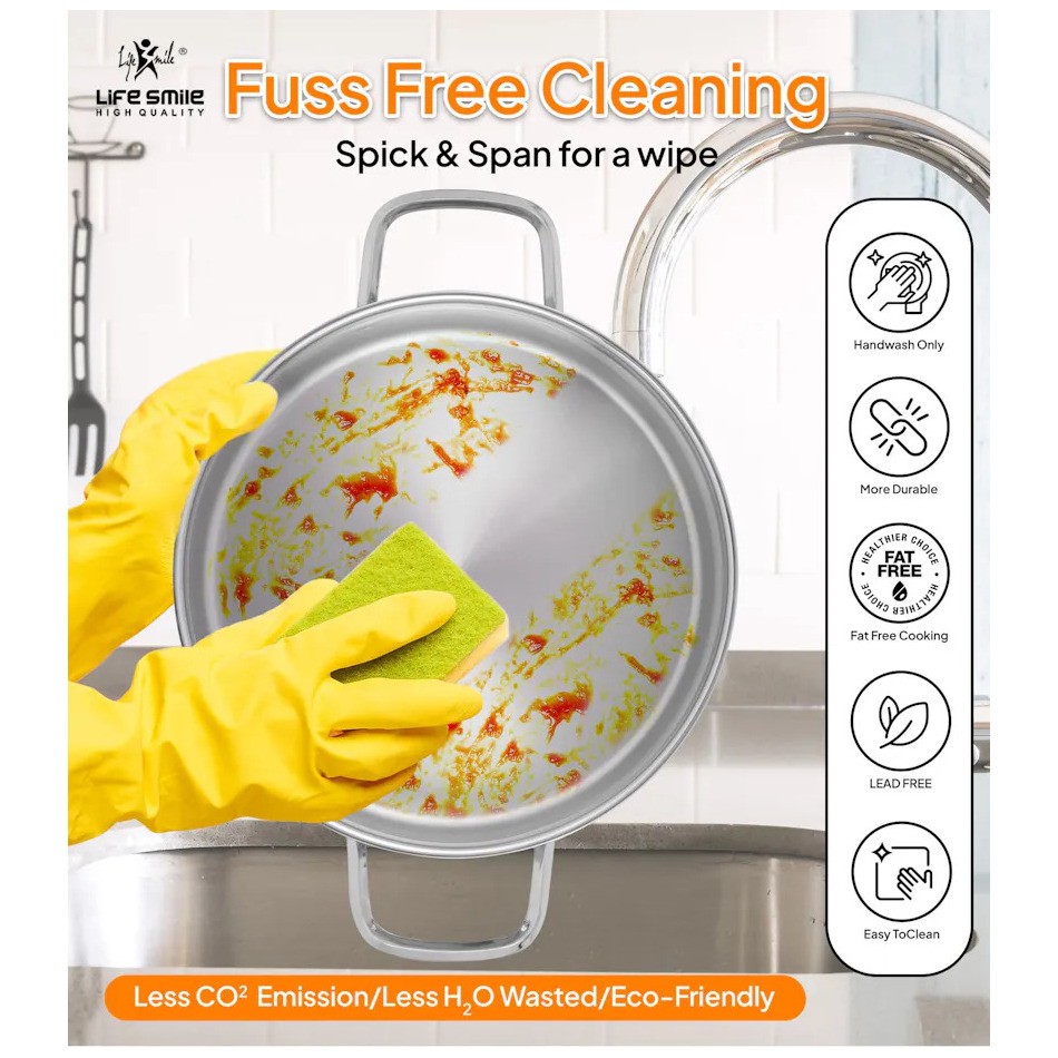 سرویس قابلمه استیل لایف اسمایل را می توان به راحتی نظافت کرد و رعایت نکات زیر به ماندگاری کالا کمک بسیاری خواهد کرد. بعد از پخت و پز اجازه دهید تابه تا دمای محیط سرد شده بعد شسته شود. ترجیحا به صورت دستی شستشو انجام شود. از اسکاچ های نرم و مواد شوینده غیر تهاجمی استفاده کنید و هم چنین می توان از ترکیب آب و اسید ملایم مانند سرکه یا آب لیمو برای جلای بدنه تابه استفاده بکنید
