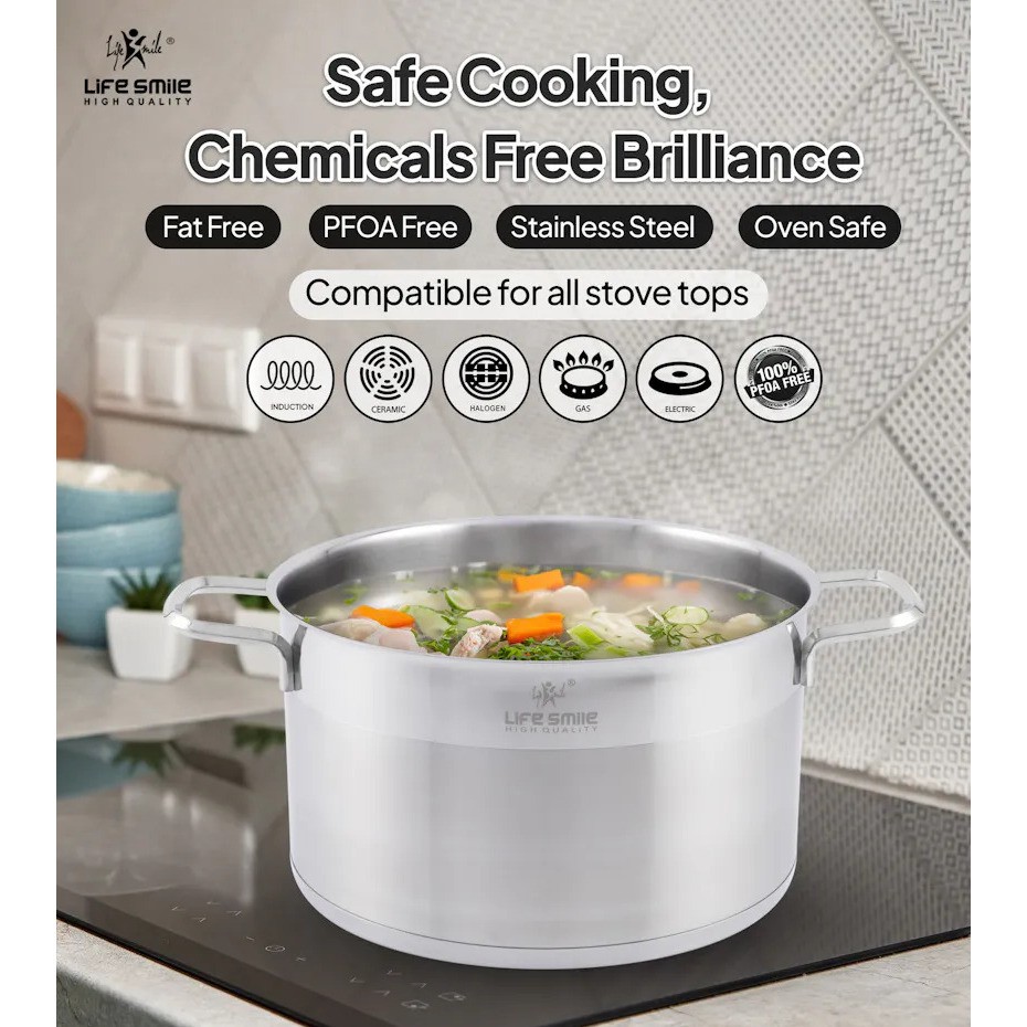 سرویس قابلمه 10 پارچه لایف اسمایل دارای درب شیشه ای همراه با منفذ خروج بخار آب می باشد و همچنین لبه های درب به نحوی طراحی شده که بخار و قطرات تولید شده به داخل ظرف برگردد. این سرویس استیل زیبا دارای کفه القایی می باشد و علاوه بر اجاق های القایی می توان از آن بر روی اجاق های سرامیکی، گازی، هالوژنی و الکتریکی نیز استفاده کرد.