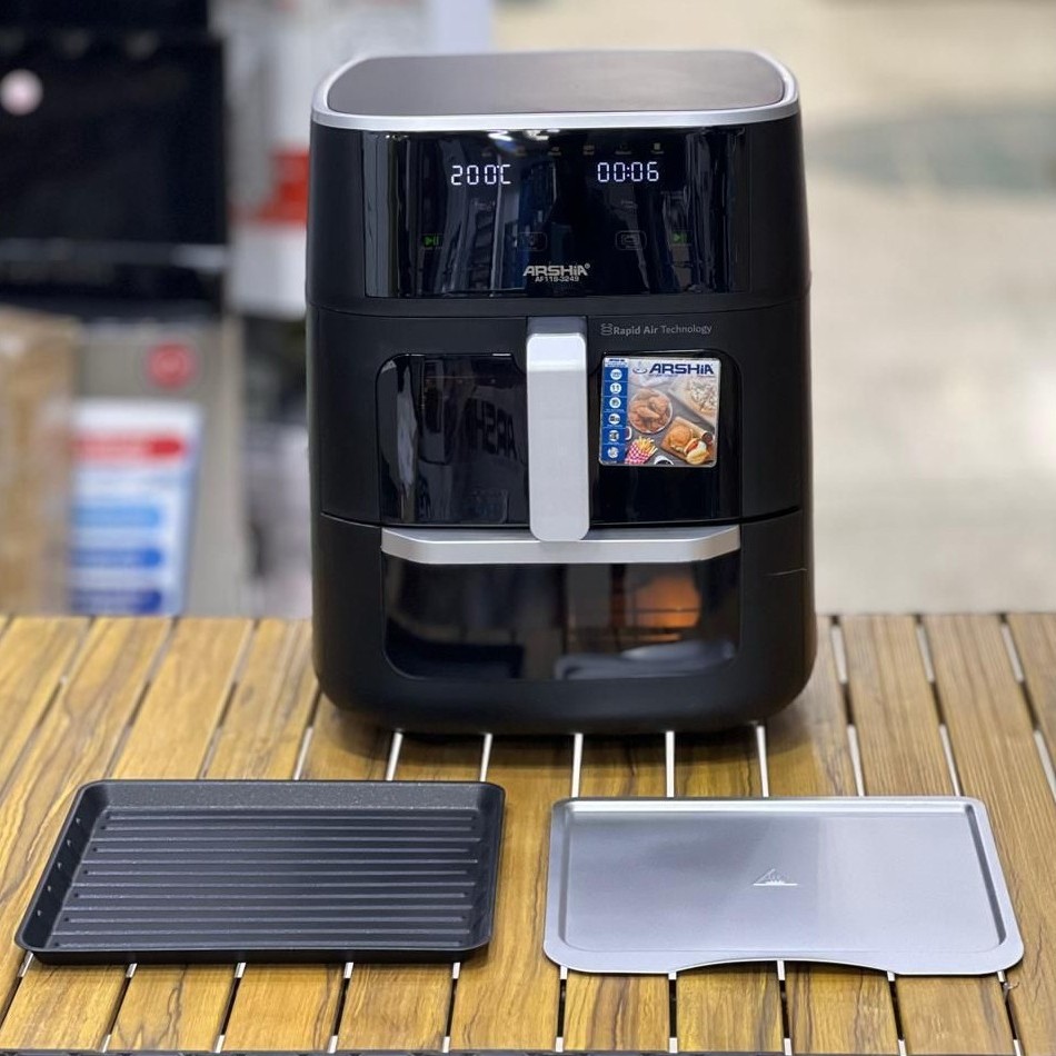 سرخ کن ARSHIA AF118-3249 در 2 طبقه با حجم 11 لیتر ساخته شده طبقه بالا دارای سبد با ابعاد ارتفاع 12 سانتی متر و قطر 25 سانتی متر برای سرخ کردن و طبقه پایین سینی با ابعاد طول 26 سانتی متر و عرض 23 سانتی متر برای گریل کردن است. جنس سبد این سرخ کن از سرامیک نچسب ساخته شده که به راحتی تمیز می شود . سبد و سینی قابل جدا شدن از بدنه هستند و به آسانی شسته می شوند. این مدل سرخ کن دارای پنجره مشاهده غذا است و همچنین داخل آن یک لامپ تعبیه شده که بدون باز کردن درب آن بتوانید مراحل آماده شدن غذا را مشاهده نمایید و از هدر رفتن انرژی جلوگیری کنید.