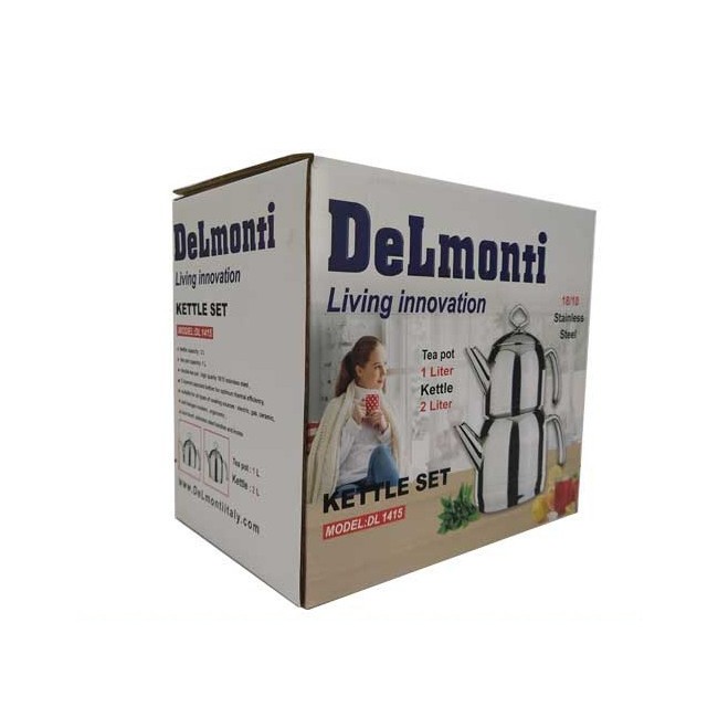 ست کتری و قوری دلمونتی مدل 1415 DL که حجم و ظرفیت کتری دو لیتر می باشد و ظرفیت قوری آن یک لیتر است که برای خانواده های کم جمعیت مناسب می باشد. کتری و قوری دلمونتی ساخت چین و تحت لیسانس دلمونتی ایتالیا می باشد. از مشخصات کتری و قوری دلمونتی می توان به موارد زیر اشاره داشت :