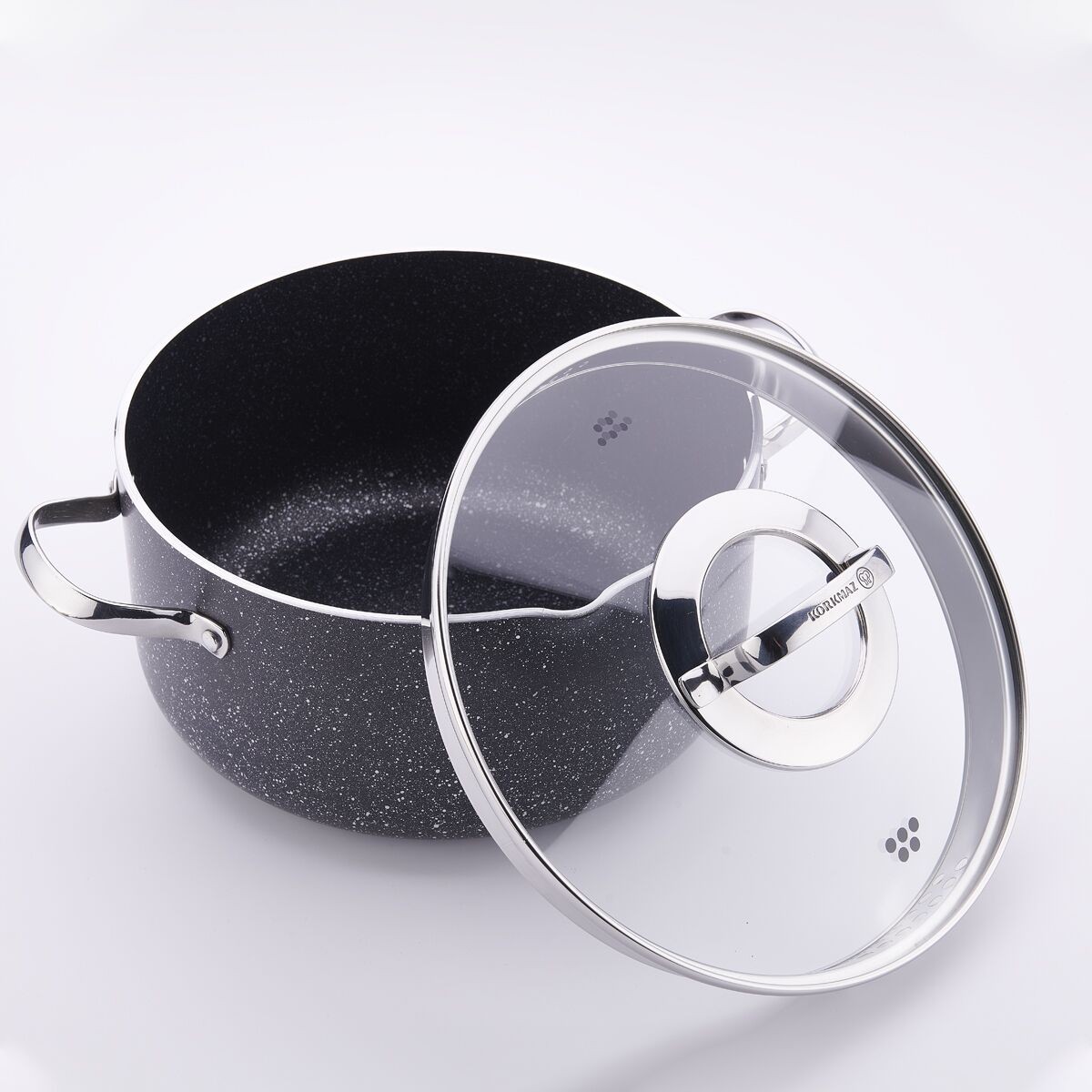 قابلمه KORKMAZ GALAKSI A2957 دارای ساختار آلومینیوم ریخته گری با روکش گرانیت است. آلومینیوم رسانای خوب حرارت بوده که در حرارت کم نیز بهترین عملکرد پخت و پز را دارد و در کمترین زمان دمای تمامی قسمت های قابلمه را بالا می برد و غذا به صورت یکنواخت پخته می شود. پوشش داخلی قابلمه گرانیت می باشد که در مقابل خط و خراش بسیار مقاوم است و دارای خاصیت نچسب بودن بوده و شما می توانید با کمترین میزان روغن لذیذترین غذاها را بپزید و نگران چسبیدن به کف قابلمه نباشید. گرانیت به راحتی تمیز می شود و حتی می توانید در ماشین ظرفشویی نیز قرار دهید.