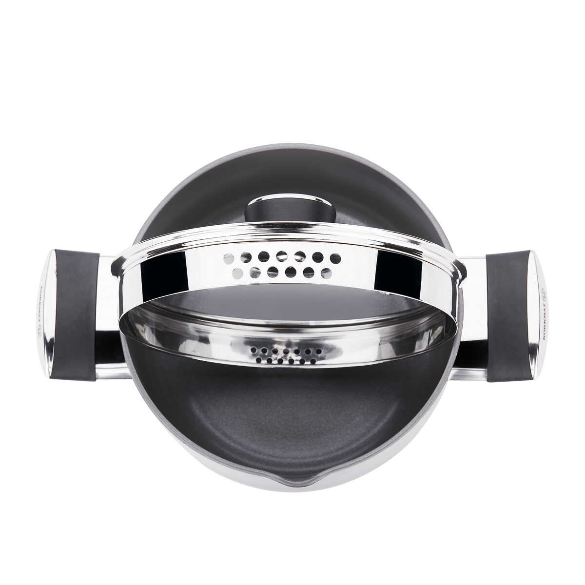 سرویس قابلمه کرکماز مدل لنا Lena A3891 از سرویس های زیبا، با کیفیت و با دوام برند ترکیه ای کرکماز بوده که با دسته هاس استیل همراه با روکش باکالیت کاربری راحت و دلپذیری را ایجاد می کند. سرویس قابلمه گرانیتی کرکماز 3891 هفت پارچه بوده و شامل 2 قابلمه با سایز های 18*9 و 10*10.5 و ظرفیت های 3 و 5 لیتر می باشد. 1 عدد تابه دو دسته درب دار و 1 عدد تابه تکدسته بدون درب سایز 26 نیز همراه با این سرویس بوده که با ارتفاع های 7.5 و 5.5 سانتی متر 3.5 و 2.5 لیتر ظرفیت را شامل می باشد. درب های این سرویس از شیشه مقاوم می باشد و لبه آنها در دو طرف به صورت مشبک در دو سایز مختلف ایجاد شده تا بتوان به راحتی انواع مواد غذایی در سایز های مختلف ازجمله برنج، پاستا و ... را آبکش کرد. همچنین دهانه ایجاد شده در لبه قابلمه ها به این امر کمک خواهد کرد.