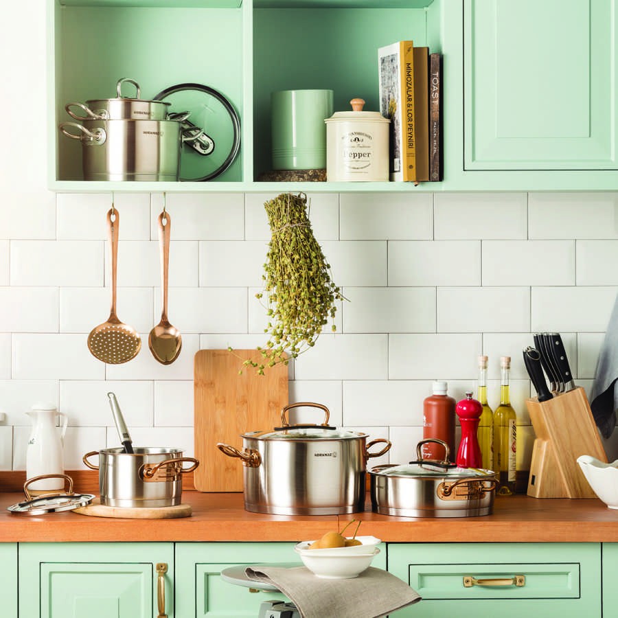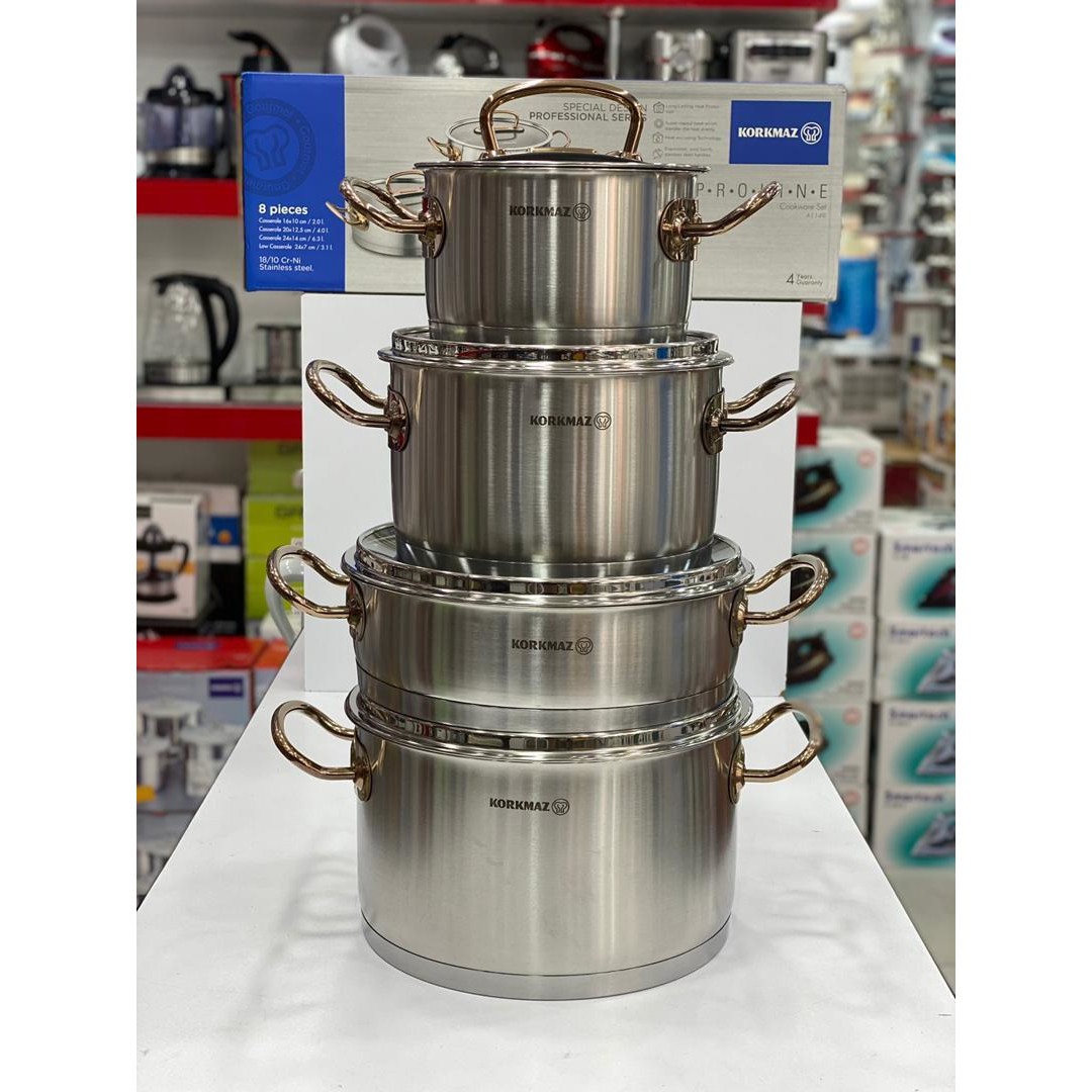 سرویس قابلمه استیل کرکماز مدل پرولاین A1149 یکی از دیگر سرویسهای پخت و پز زیبا و با کیفیت شرکت کرکماز ترکیه میباشد. دستگیرههای این سرویس از استیل ضد زنگ و به رنگ زرگلد (متمایل به رنگ مسی) ساخته شده است. برای ساخت قابلمهها از استیل ضد زنگ 18/10 (Cr-Ni 18/10 stainless steel) استفاده گردیده که این استیل حاوی 18 درصد کروم و 10 درصد نیکل میباشد. وجود کروم و نیکل در این استیل باعث مقاومت و ظاهر براق قابلمهها خواهد شد.