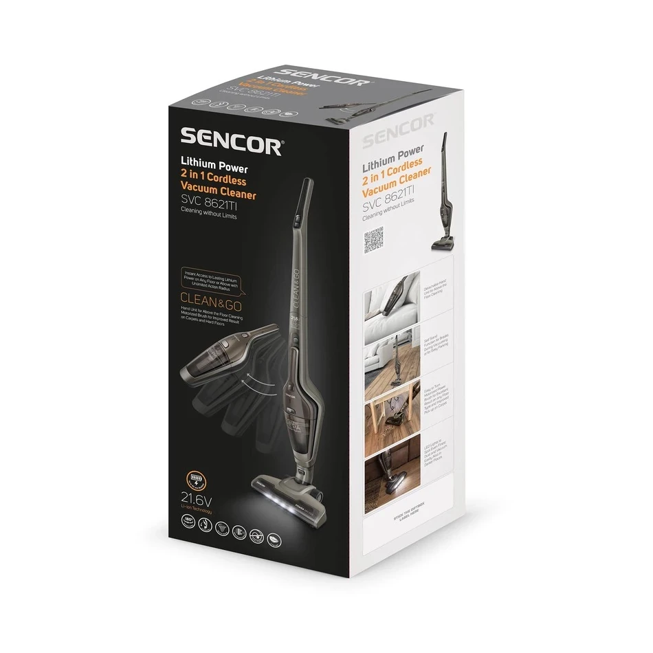 جارو شارژی سنکور مدل SVC 8621TI محصولی دیگر از برند نام آشنای SENCOR می باشد. این جارو شارژی هم به صورت دستی و هم عصایی قابل استفاده بوده و ارتفاع دسته آن قابل تنظیم است. منبع انرژی آن باتری خازنی 21.6 ولت لیتیومی است که با 6 ساعت شارژ شده و 50 دقیقه مداوم کار می کند و به دلیل نداشتن سیم آزادانه به هر جا که بخواهید می رود و کار نظافت را برایتان لذت بخش می کند. جارو شارژی سنکور مدل 8621 بسیار سبک، کم صدا و قدرتمند بوده و انواع کف، فرش و موکت و لوازم منزل را تمیز می کند. این جارو شارژی دارای دو سطح سرعت است که از سرعت توربوی آن برای زمانی که جاروی طولانی مدت می کشید قابل استفاده است.