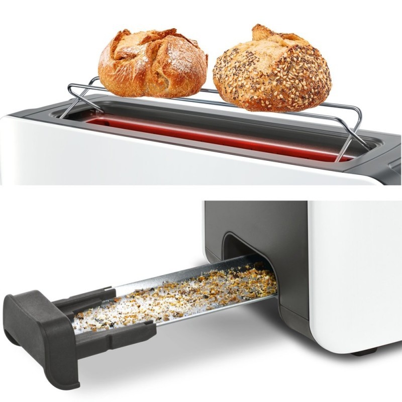 توستر بوش مدل TAT6A001 دارای یک رول فلزی در قسمت بالای دستگاه است. از آنجایی که دستگاه مجهز به سیستم گرمایش تابشی بوده و حرارت را به سمت سطح هدایت می کند، برای گرم کردن انواع کروسان و شیرینی کافی است آنها را بر روی این رول فلزی قرار دهید. همچنین به وسیله عملکرد یخ زدایی و گرم کردن مجدد، نان تست را یخ زدایی می کند و آن را برشته می کند تا ترد شود.