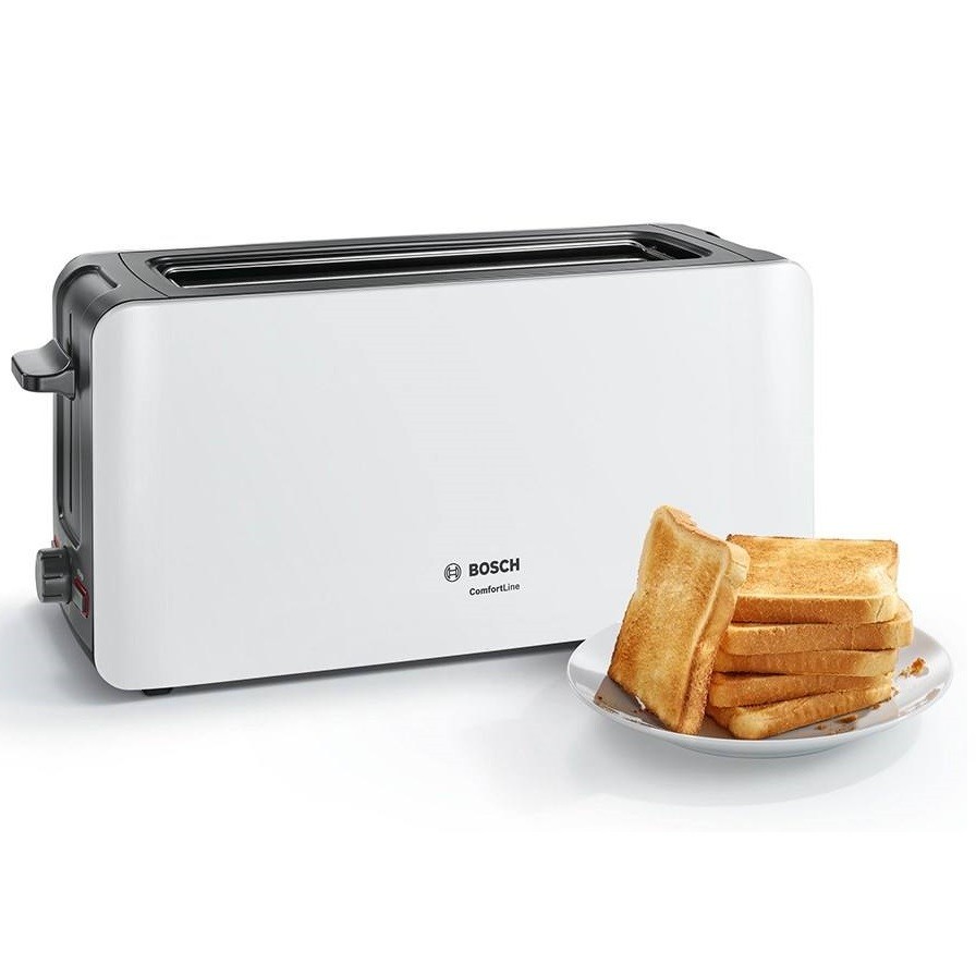 گاهی اوقات شما فقط می خواهید یک تکه نان کوچک را برای صبحانه برشته کنید. اما این کار برای اکثر توسترها دشوار است و هنگام برداشتن نان از محفظه انگشتان شما می سوزد. اما در توستر نان BOSCH TAT6A001 به لطف بالا برنده (High Lift)، این مشکل به وجود نیامده و نان تست به اندازه ای بالا می آید که انگشتان شما نسوزند. در کنار این، برای خوردن صبحانه ای پرقدرت شما باید نان تست خود را آنطور که دوست دارید میل کنید. اگر اغلب یک تکه نان بزرگ را برشته می کنید، باید از توستر با شکاف بلند استفاده کنید؛ زیرا با آن می توانید یک یا دو تکه نان بزرگ را برای صبحانه خود برشته کنید.