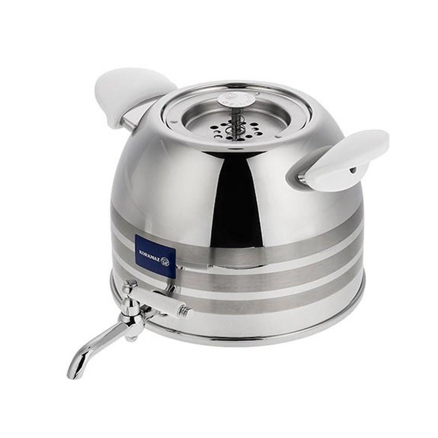 کتری و قوری کرکماز مدل رابی آسترا A012 یکی از محصولات زیبا و شیک برند کرکماز میباشد. جنس بدنه کتری از استیل ضد زنگ 18/10 (Cr-Ni 18-10 Stainless Steel) میباشد و قوری از جنس چینی تهیه شده است. این ست در مجموع 6 لیتر گنجایش داشته که کتری 5 لیتر و قوری 1 لیتر از ظرفیت کلی را به خود اختصاص دادهاند. خطوط مات نقش بسته بر روی بدنه کتری و قوری کرکماز جلوه بسیار زیبایی به ست داده است.