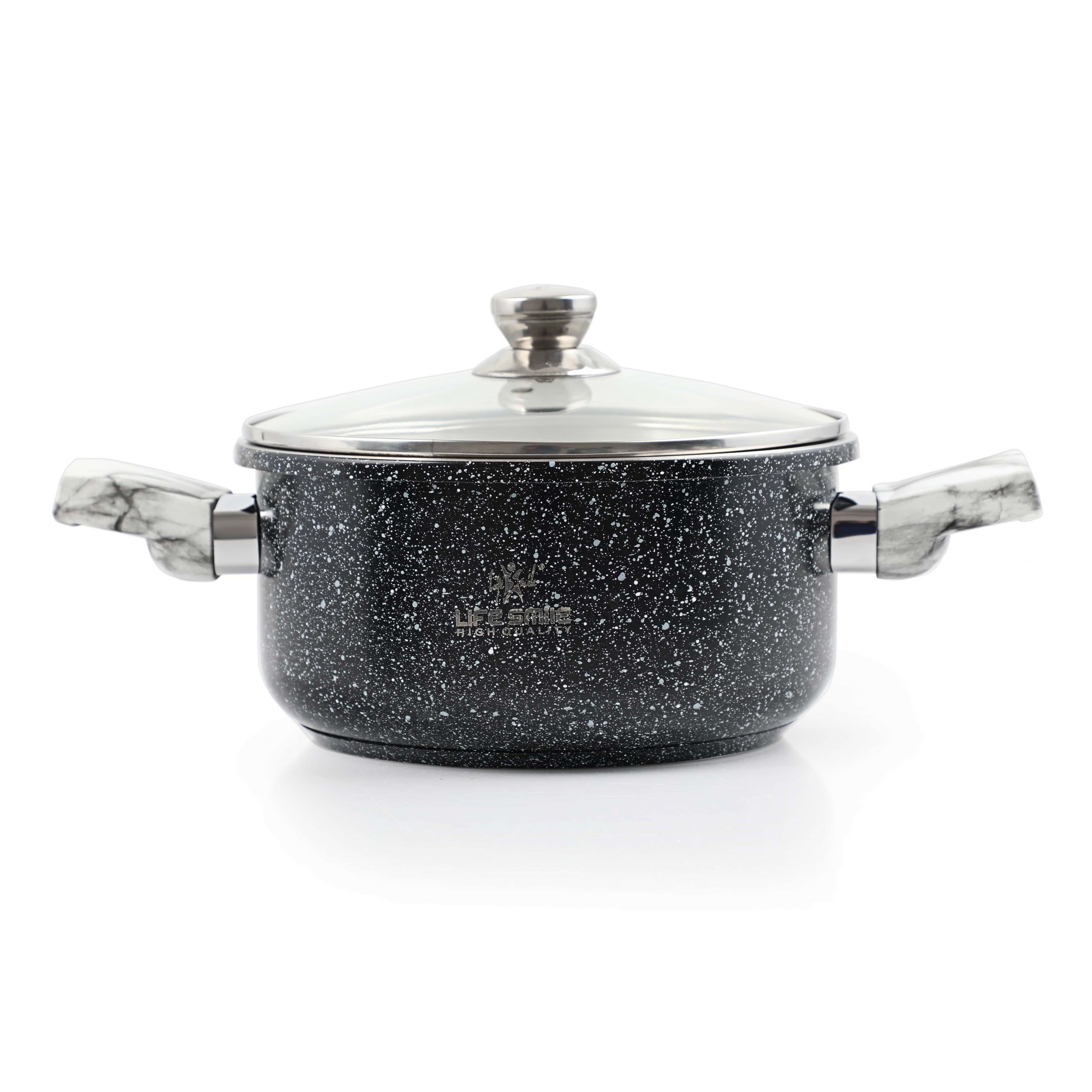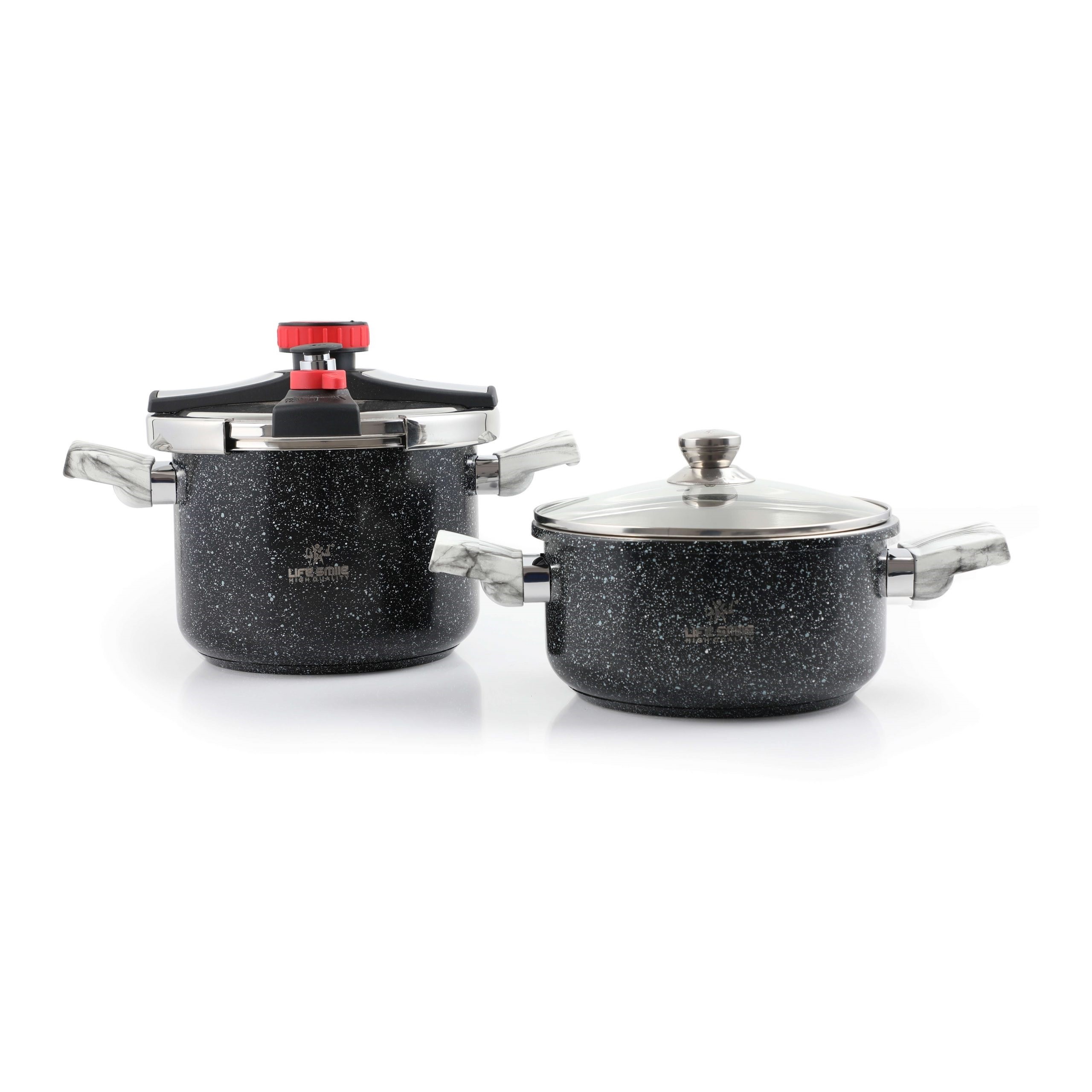 زودپز دو قلو لایف اسمایل مدل ZDS-7+5M یکی دیگر از محصولات با کیفیت و کاربردی برند معتبر LIFE SMILE است. این ست از یک دیگ بزرگ به گنجایش 7 لیتر و یک دیگ کوچک به گنجایش 5 لیتر تشکیل شده است. شما با توجه به نیاز خود میتوانید از هر کدام از دیگها به عنوان زودپز استفاده کنید و با توجه به درب شیشهای که به همراه ست وجود دارد، دیگها قابلیت استفاده به عنوان قابلمه هم دارند. جنس بدنه دیگها از استیل ضد زنگ 18/10 کروم و نیکل است که بسیار مقاوم بوده و رسانای خوبی برای گرما هستند. پوشش بیرونی زودپز گرانیتی است که در مقابل هر گونه خط و خش مقاوم بوده و همچنین شستشوی دیگها را راحت خواهد کرد.