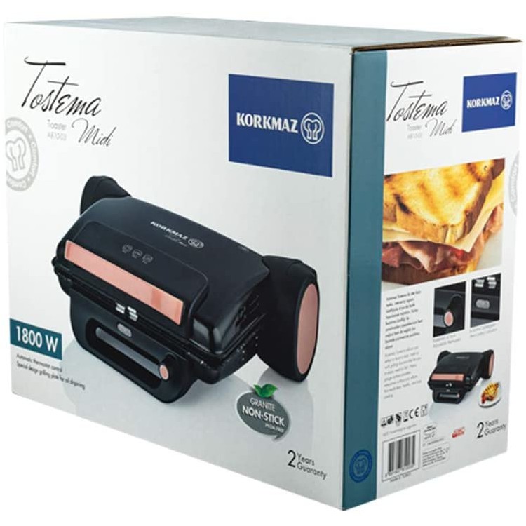 ساندویچ ساز و گریل کرکماز مدل توستما A 810 یکی دیگر از محصولات با کیفیت برند کرکماز میباشد که دارای ویژگیهای پخت چند منظوره از جمله سرخ کردن، گریل کردن، تست و ساندویچ میباشد. برای ساخت بدنه این محصول از استیل ضد زنگ استفاده شده است. گریل کرکماز دارای دو صفحه پخت از جنس آلومنیوم و با روکش تفلون (PTFE) میباشد که استفاده از تفلون بر روی صفحات پخت موجب نچسب بودن آنها شده است. صفحات پخت به آسانی قابل جداسازی بوده و تمیز خواهند شد.
