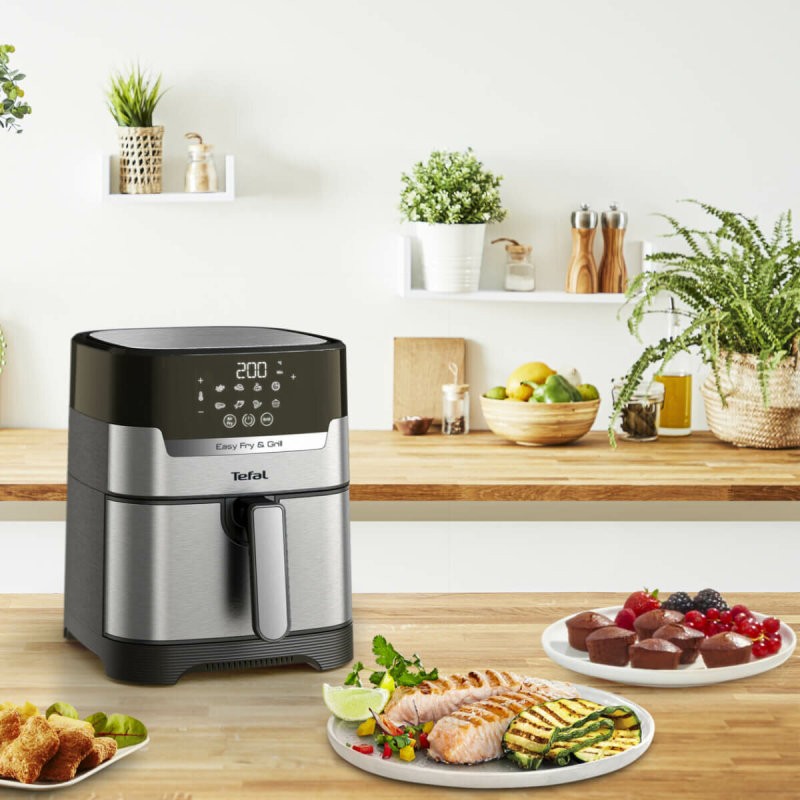 سرخ کن تفال مدل EY505 یکی از محبوب ترین محصولات شرکت تفال در زمینه تهیه غذاست. این دستگاه دارای قابلیت های زیادی برای سرخ کردن مواد غذایی از جمله مرغ، کباب، سیب زمینی، سبزیجات، ماهی و ... می باشد. طراحی آن بسیار زیبا بوده و با هر دکوراسیون آشپزخانه ای هماهنگ می شود. یکی از مزایای این دستگاه سرعت بالای پخت غذا است. این سرخ کن دارای توان بالای 1400 وات است و با آن میتوانید در کمتر از ۳۰ دقیقه غذاهایی مثل سیب زمینی سرخ شده و مرغ سرخ شده را درست کنید. سرخ کن تفال مدل 505 بدون نیاز به روغن و با مصرف کمترین میزان روغن ممکن، غذاها را پخت و سرخ میکند. این ویژگی دستگاه مناسب برای افرادی است که دچار مشکلاتی مانند چربی خون بالا هستند و نیاز به پخت و سرخ کردن غذاهای سالم و با کمترین مقدار چربی دارند.