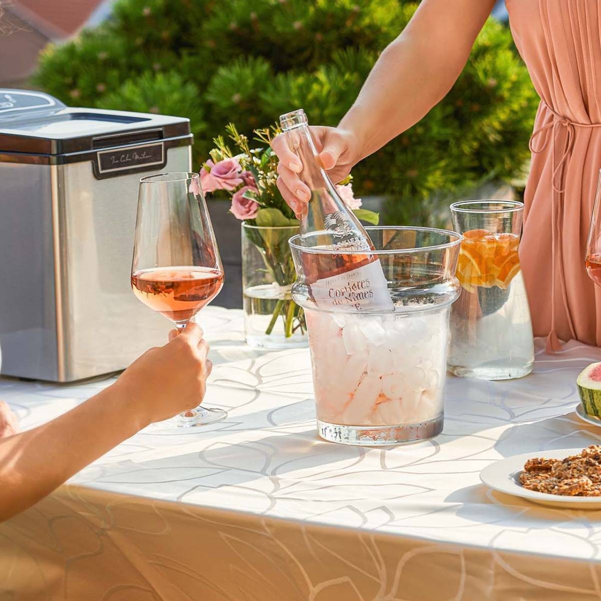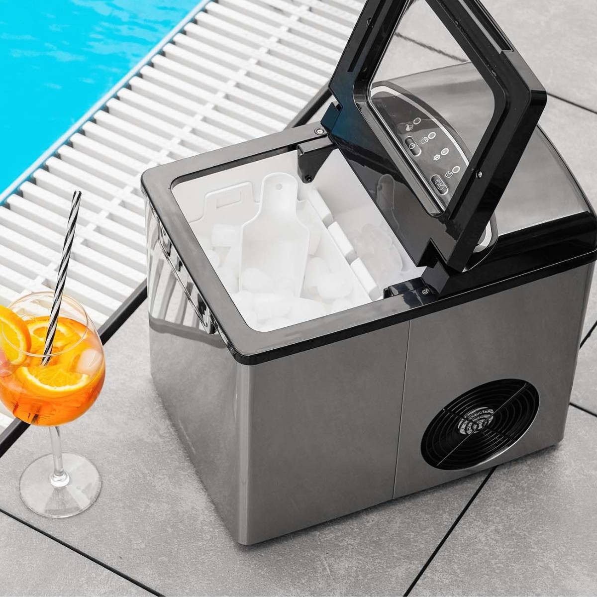 با استفاده از این یخ ساز می توانید یخ کلاهی شکل کاملا شفاف و بدون حباب هوا را در کمترین زمان آماده کنید یا بطری آب و نوشابه را خنک کنید. این یخ ساز حرفه ای دارای مخزن 1.9 لیتری است و هر بار توانایی درست کردن 9 مکعب یخ را دارد و می توانید بنابر نیاز خود تکه های یخ کوچک یا بزرگ را از دستگاه بخواهید و اندازه تکه های یخ را انتخاب کنید و سپس دکمه استارت را بزنید. بنابراین دیگر لازم نیست نگران نداشتن فریزر برای درست کردن و نگهداری یخ باشید. لازم به ذکر است که دسته این دستگاه جهت حمل کردن راحت تر، کاملا ارگونومیک طراحی شده است.