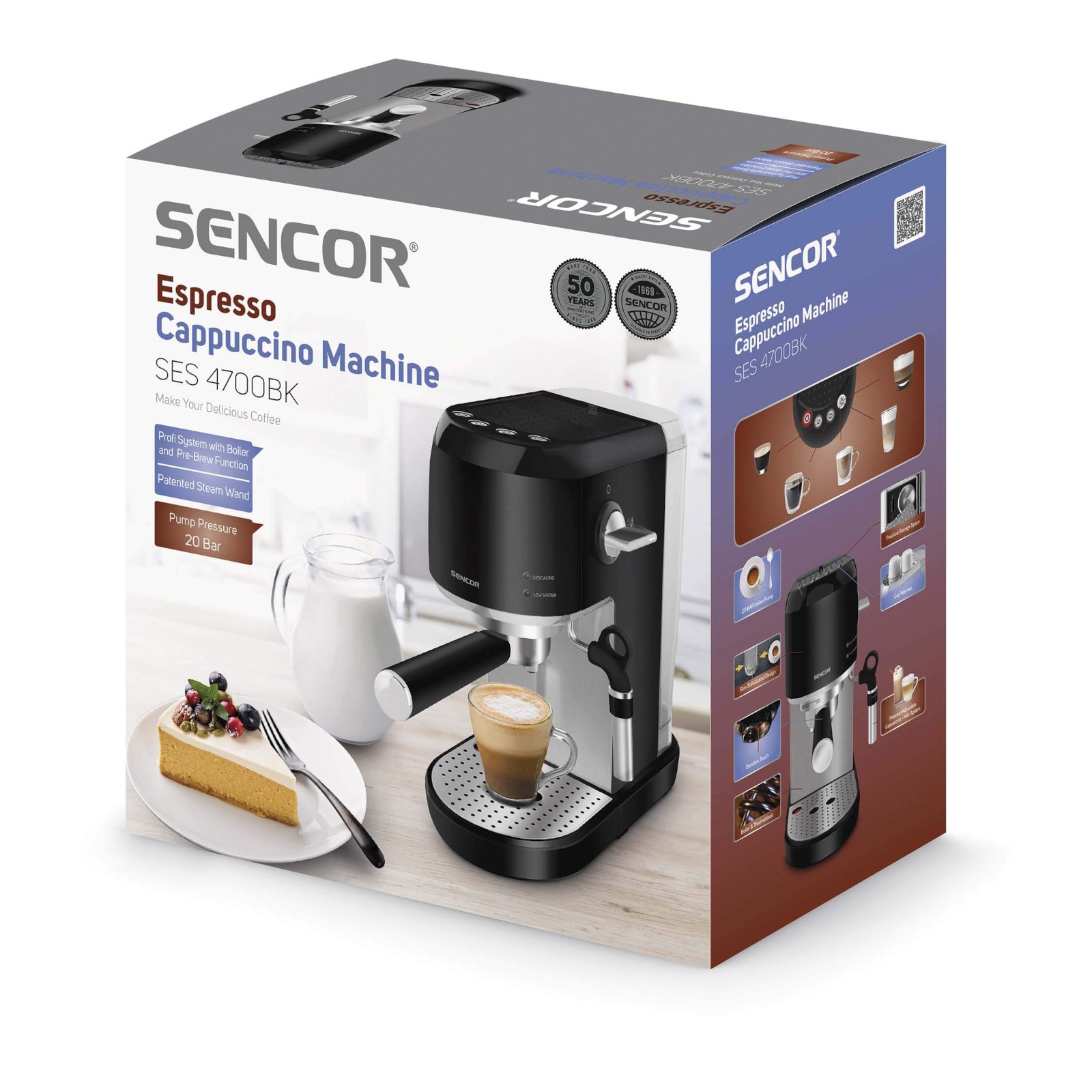 اسپرسوساز سنکور مدل SES4700 BK یکی دیگر از محصولات برند معتبر سنکور می باشد که با توان دستگاه 1400 وات و فشار بخار 20 بار طراحی شده است. ظاهر آن بسیار زیبا و جنس بدنه آن ترکیبی از پلاستیک با کیفیت و استیل ضد زنگ بوده که از استحکام بالایی برخوردار می باشد. مخزن آب این دستگاه از جنس پلاستیک شفاف که دارای ظرفیت 1.5 لیتر است که بسیار مناسب بوده و می توان تعداد بیشتری نوشیدنی در هر بار استفاده از آن درست کرد. این دستگاه آسیاب نداشته و مناسب برای پودر قهوه و کیسه قهوه میباشد. با این اسپرسوساز می توان نوشیدنی های مربوط به قهوه مانند اسپرسو، آمریکانو، لاته و... را تهیه کرد.