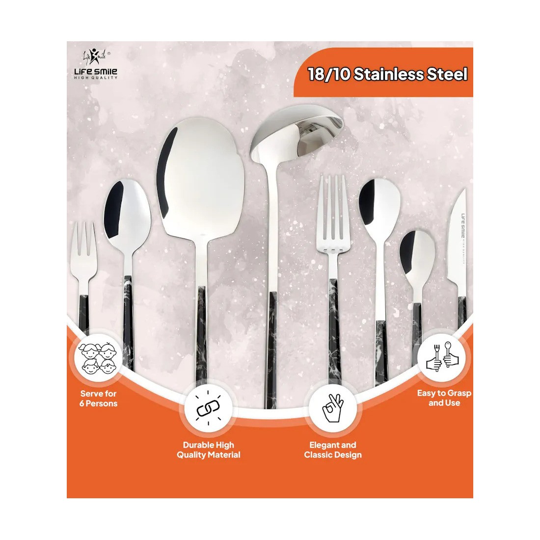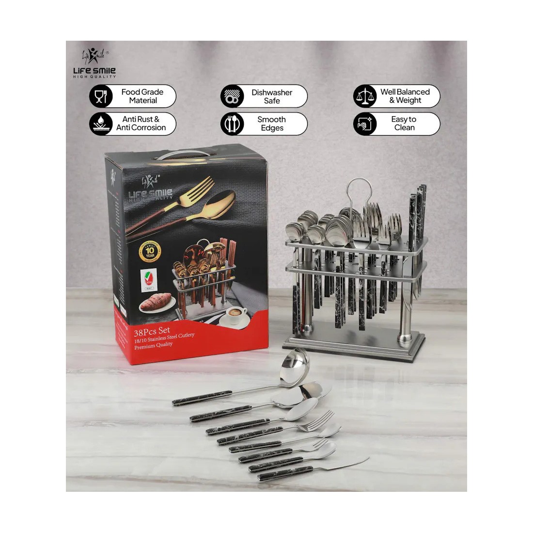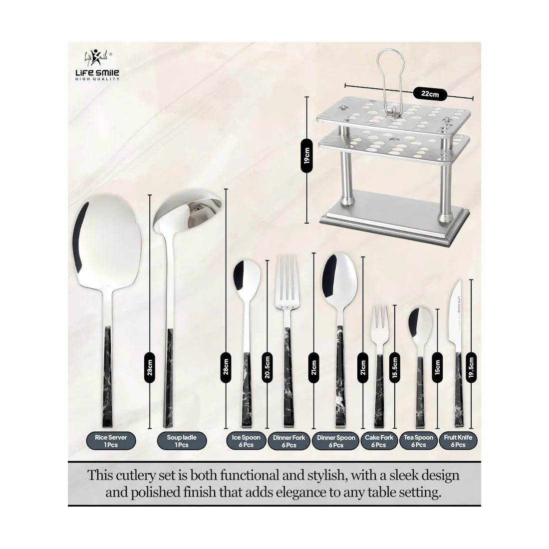 سرویس کارد و قاشق چنگال لایف اسمایل مدل Cut 38P 2 محصولی زیبا و کاربردی از برند Lifesmile بوده که از استیل ضدزنگ 18/10 نیکل کروم ساخته شده که با ظاهری براق، درخشنده و یکدست و دسته هایی از جنس مرمر مشکی مناسب برای استفاده در خانه، محل کار و کافه ها می باشد. این سرویس بر روی یک استند فلزی مربعی شکل به حالت زیبا و منظمی قرار می گیرد. سرویس قاشق چنگال لایف اسمایل 38P مشکی دارای وزن مناسب و طراحی ارگونومیک بوده و در حین استفاده از خستگی دست جلوگیری می کند. این سرویس شامل 6 عدد قاشق غذا خوری، 6 عدد چنگال غذا خوری، 6 عدد کارد میوه خوری، 6 عدد چنگال کیک خوری، 6 عدد قاشق چای خوری، 6 عدد قاشق بستنی خوری، 1 عدد کفگیر و 1 عدد ملاقه می باشد.