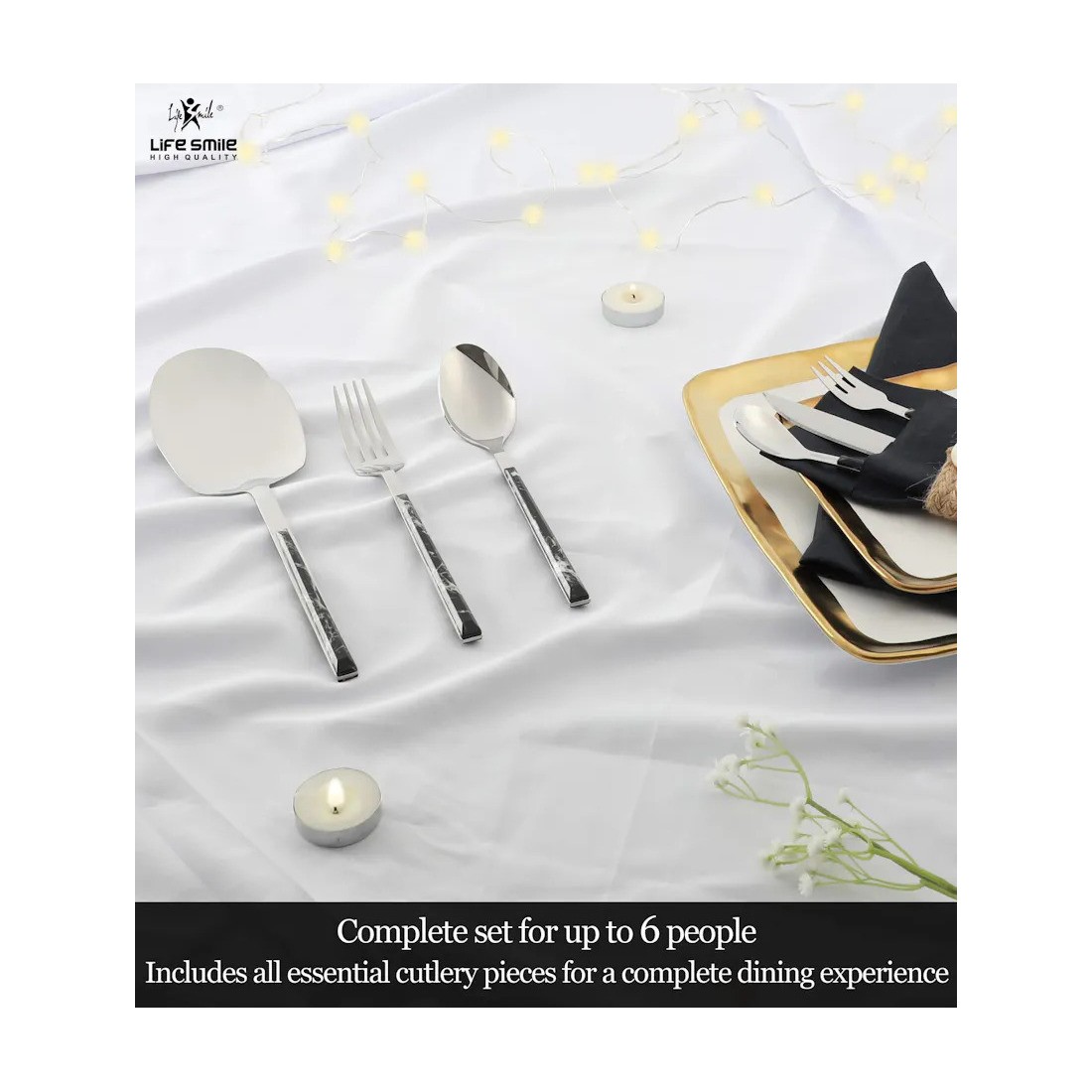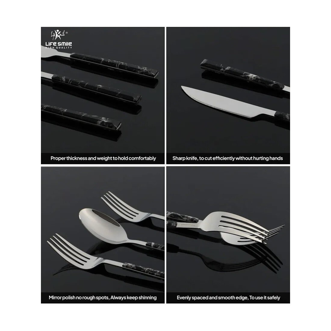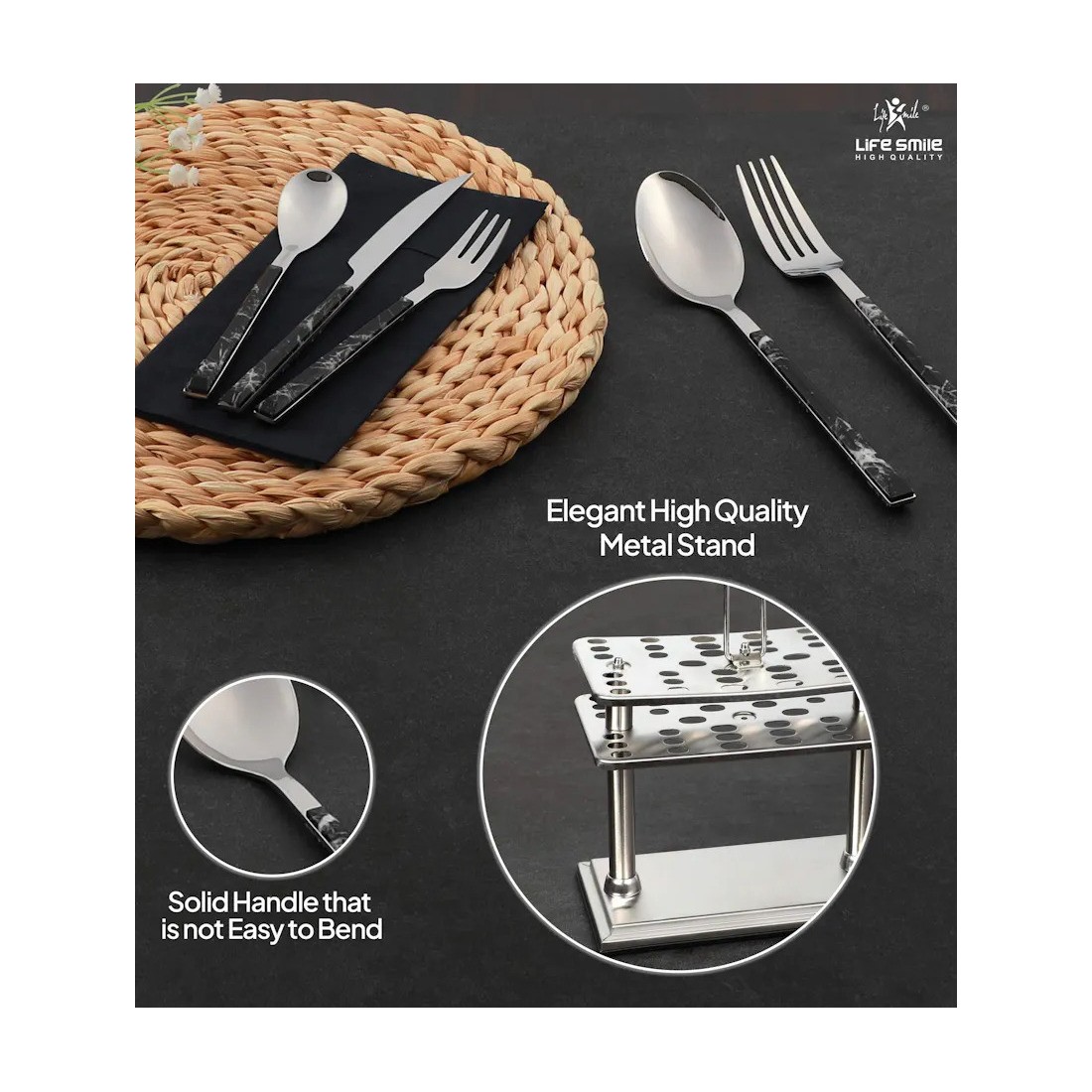 سرویس کارد و قاشق چنگال لایف اسمایل مدل Cut 38P 2 محصولی زیبا و کاربردی از برند Lifesmile بوده که از استیل ضدزنگ 18/10 نیکل کروم ساخته شده که با ظاهری براق، درخشنده و یکدست و دسته هایی از جنس مرمر مشکی مناسب برای استفاده در خانه، محل کار و کافه ها می باشد. این سرویس بر روی یک استند فلزی مربعی شکل به حالت زیبا و منظمی قرار می گیرد. سرویس قاشق چنگال لایف اسمایل 38P مشکی دارای وزن مناسب و طراحی ارگونومیک بوده و در حین استفاده از خستگی دست جلوگیری می کند. این سرویس شامل 6 عدد قاشق غذا خوری، 6 عدد چنگال غذا خوری، 6 عدد کارد میوه خوری، 6 عدد چنگال کیک خوری، 6 عدد قاشق چای خوری، 6 عدد قاشق بستنی خوری، 1 عدد کفگیر و 1 عدد ملاقه می باشد.