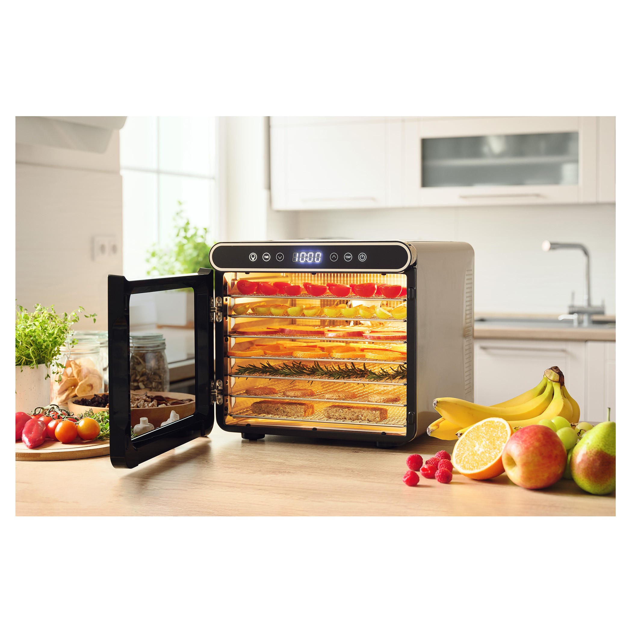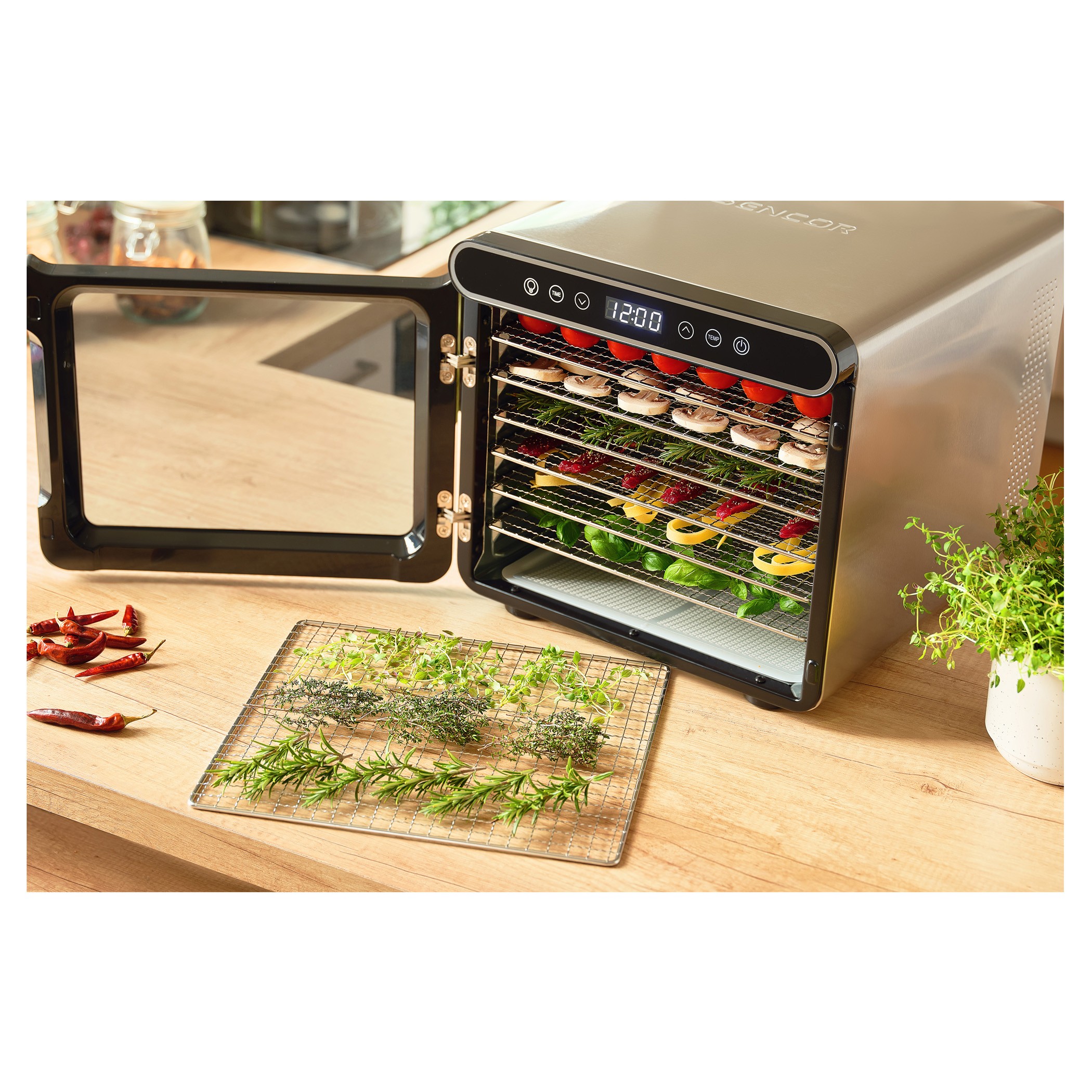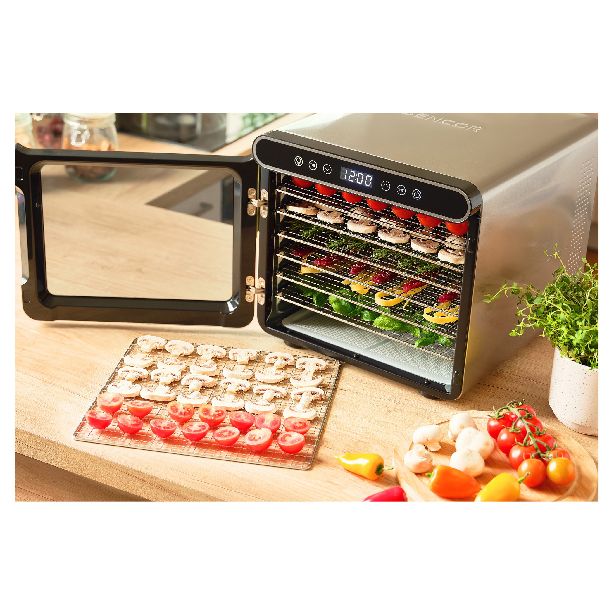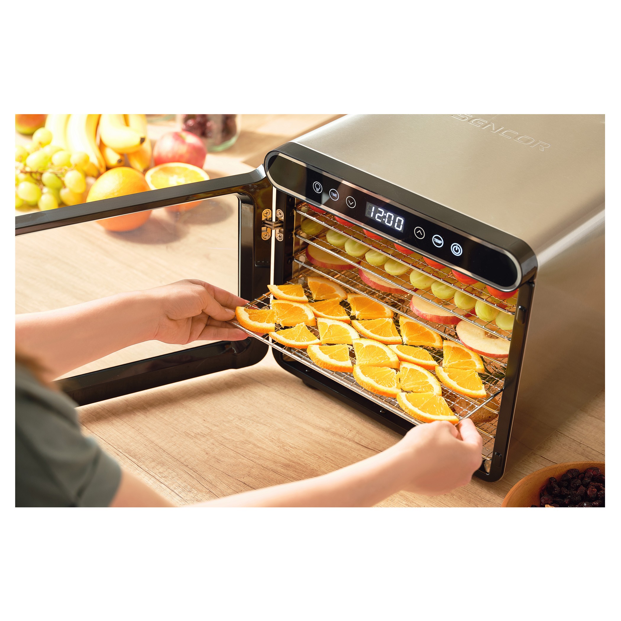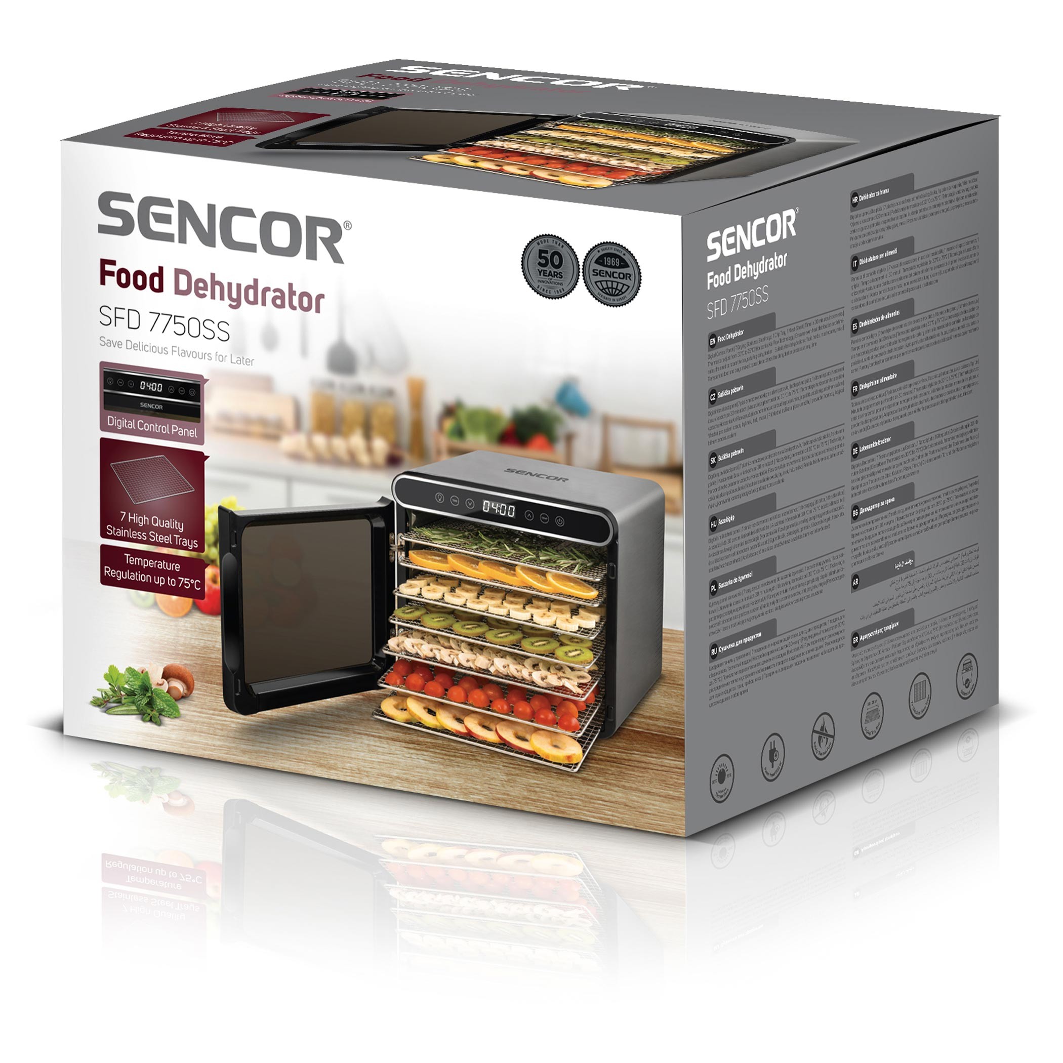 میوه خشک کن SENCOR 7750 دارای بدنه ای از ترکیب پلاستیک و فلز می باشد و درب و صفحات شفاف این شرایط را فراهم می کند که محصولاتی همچون انواع سبزیجات، انواع میوه، کشمش، قارچ، گوشت، ماهی، انواع برگ های چای و ... را در حین خشک کردن مشاهده کرد.